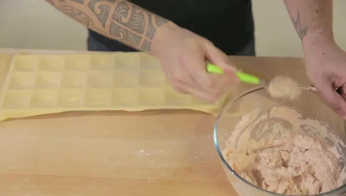 - Con l'aiuto di uno stampo per ravioli o manualmente, riempire la sfoglia di pasta con il ripieno, coprire con un'altra sfoglia e sigillare bene i bordi.